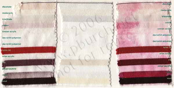 Country or region: USA Message: I'm not entirely certain if you answered this question or not (I spent 15 minutes on your FAQ page). But, I was wondering if you could tell me where you acquired your Multi-Fibre strips? They seem to be much smaller than the ones I have found (sdc) and I need to run a gammut of dye tests. I ordered my multifiber fabric by phone from Testfabrics in Pennsylvania, after requesting their printed catalog and a current price list. The stuff I have has a polyester warp, and the weft consists of 1/3" stripes of diacetate, modacrylic, triacetate, bleached cotton, Creslan® acrylic, Dacron® 54 polyester, Dacron® 64 polyester, nylon 66, Orlon® acrylic, spun silk, polypropylene (polyolefin), viscose rayon, and worsted wool. It's about four inches wide, many yards long, and came on a spool. The closest I see on Testfabric's Multifiber Fabrics page now is MFF#43. It's not quite the same, but it's certainly close enough. It has all of the fibers I'm interested in. They have other multifiber test fabric choices, as well. Be careful to keep this stuff sealed up in plastic when not in use, or however you protect your wool from insects. After leaving a one-yard cut loose in a drawer for a year, I found that moths had eaten much of the wool section. Testfabrics also sells some blank dyeables, such as silk scarves and cotton napkins, aprons, and tablecloths, and all sorts of undyed yardage. Here's an example of the multi-fiber test ribbon: ![]() Is it necessary to pre-wash and heat-set a wall hanging that I am simply stenciling with Dye-na-Flow? Name: Phyllis