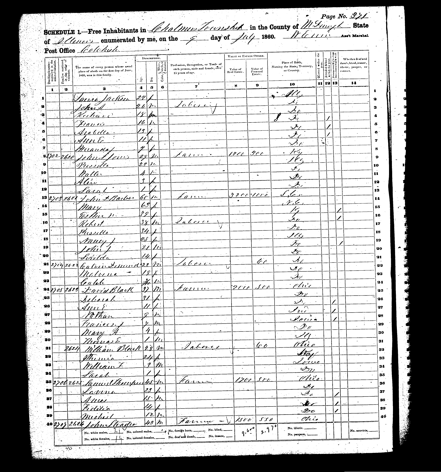 an 1860 census page for McDonough County, Illinois, showing William Black, age 28, laborer, personal property worth $60, born in Ohio, his wife Ithemia (not Ithema, as elsewhere), age 24, birthplace illegible (Kty? not Ten.), William F., age 3, born in Iowa, and Sarah,m age 1, born Ill (?).