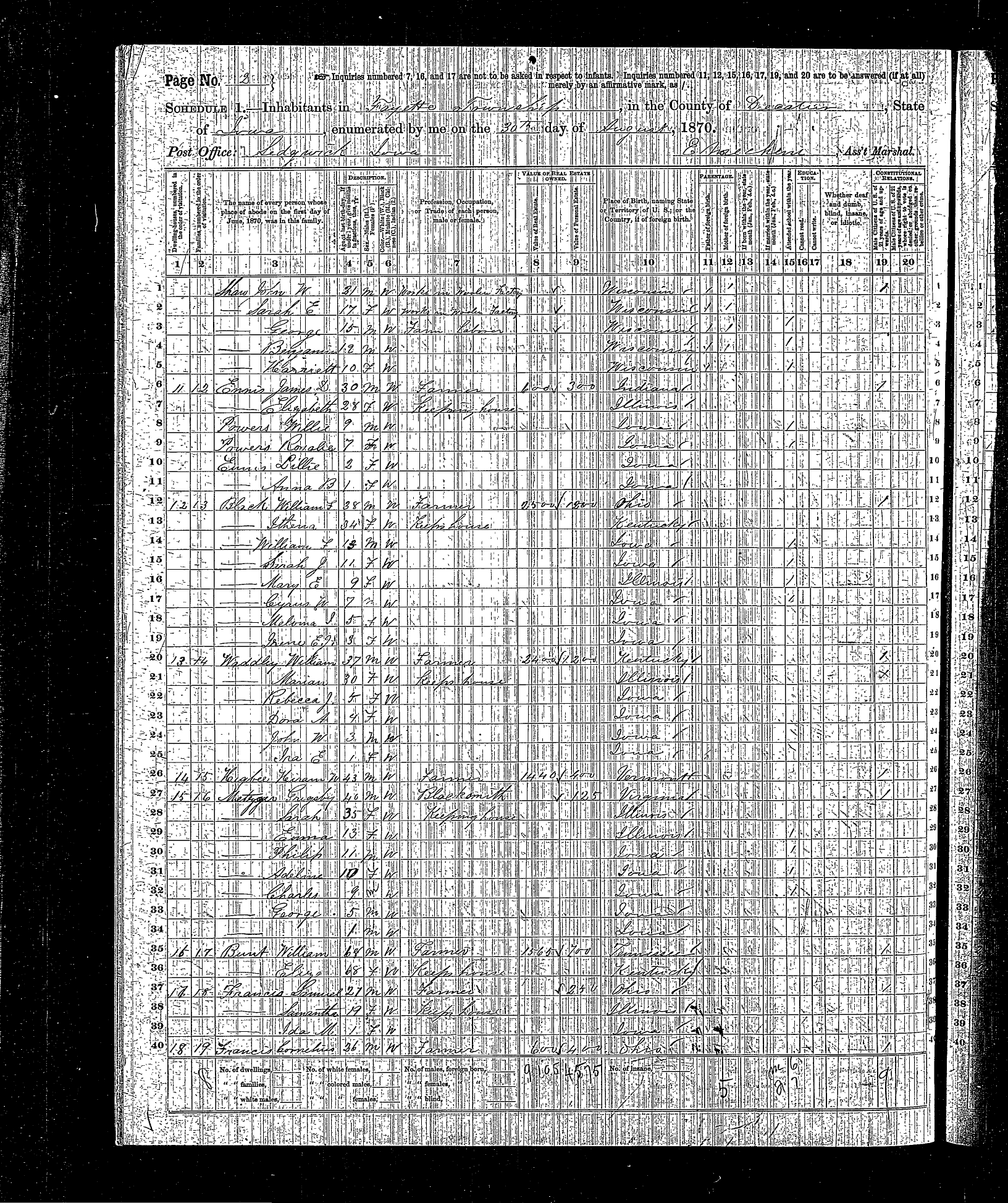 page from the 1870 census, in which he is clearly listed as William F. Black, not William T. Black! He is listed as being age 38, male, white, farmer, real estate valued at $2400, personal property at $1200, born in Ohio. This time his wife is entered as Ithena, age 34, keeps house, born in Kentucky. Their children are William F., 13, Sarah J., 11, Mary E., 9, Cyrus W., 7, Melvina I., 5, and Irene E.J., 3. Of the children, Mary was born in Illinois, and the rest in Iowa.