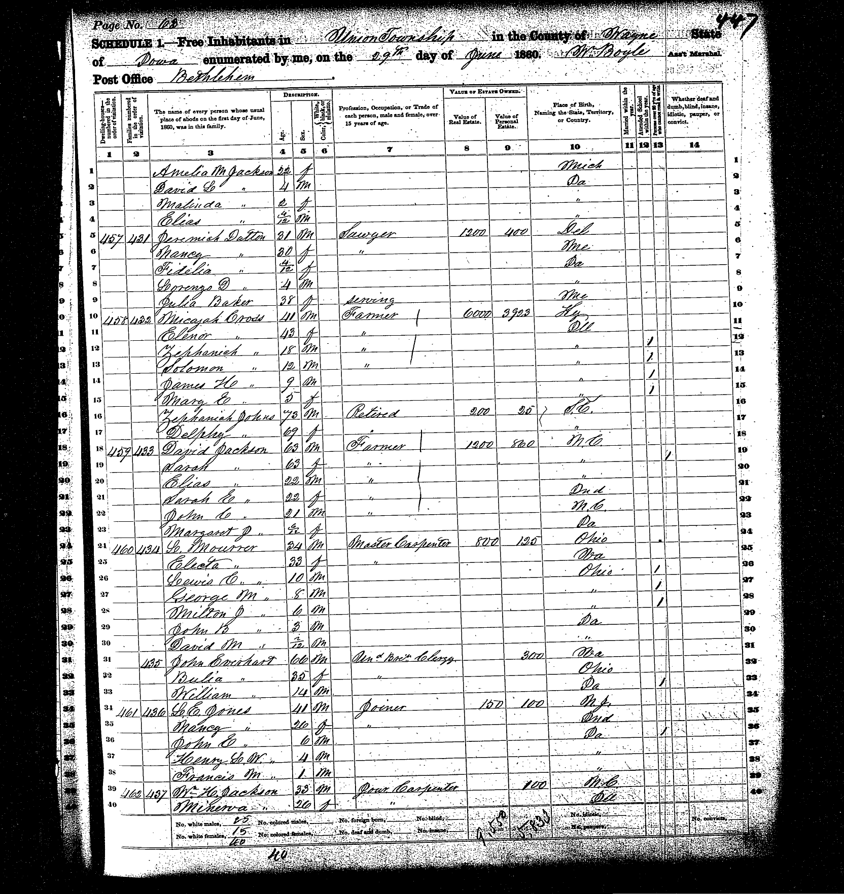 copy of a page of the 1860 census, covering Wayne County, Iowa, that I think may include Isaac Hook's father-in-law and stepmother-in-law. John Everhart on this census page is 68 years old, male, white, born in Virginia, with occupation listed as Clergy. (I cannot make out the abreviation that is part of the phrase that ends in Clergy - can you? Un.d. Bris. Clergy?) His wife is Bulia, age 35, born in Ohio, and there is also a William Everhart age 14, born in Pennsylvania. John Everhart's personal property was worth $300. The name "Bulia" seems consistant with the name Beulah given in the Hook's Point article, and the "Clergy" is consistant with my mother's old notes. Wayne County is considerably south of Hamilton County, right on the Missouri line.
