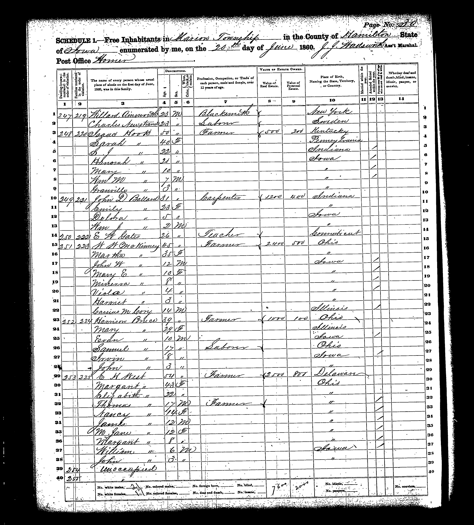 page of the 1860 US Census for Hamilton County, Iowa. Isaac Hook is listed as an inhabitant of Marion Township, and as being age 50, a farmer, with real estate worth $500 and personal property worth $200. He was born in Kentucky. His wife, Sarah Hook, was age 40, born in Pennsylvania. His children are listed as S.J., female, age 22, born in Indiana, Hannah, age 20, born in Iowa, Mary, age 10, Wm. M, age 7, and Granville, age 3, all born in Iowa.