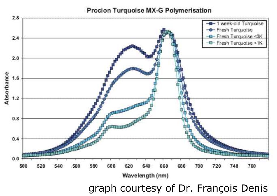 When looking for a good cyan dye to use for his research, Dr. François Denis found that the relative amount of the cyan and blue peaks changed within days of preparing the dye solution. The color shifted noticeably to become bluer, less cyan. (See his post in the Dye Forum for July 27, 2006.) We suspect the same may occur more slowly even in undissolved dye, as the dye powder ages. When he filtered the dye molecules by size, he found that the blue peak was almost entirely elimated at a molecular size below 1000 Daltons. The blue peak is apparently composed of aggregates of two or more molecules of the turquoise dye, perhaps five or ten particles. Click on the image below to see the full-sized graph....