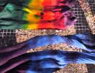 drip the dye down the length of the garment.If you like to see some little swirls of purple against the turquoise, or little swirls of orange against the yellow, then it is good to use fuchsia red MX-8B (reactive red 11) as your red. If you want smooth, even color gradations, it is better to use red MX-5B (reactive red 2) as your red. These are the color names for some popular Procion MX type dyes; you can also use Drimarene K dyes for this sort of dyeing and for tie-dyeing, as well, but I have not yet investigated their individual properties. If you do not already have a source for fiber reactive dyes, since you are located in Australia, I recommend that you order them by mail from Batik Oetoro, Kraftkolour, or Silksational. Contact information for these and other companies around the world are listed on my Sources for Dyeing Supplies page. Scroll down on that page to the section on Australia. (Please help support this web site. Thank you.) Wednesday, November 02, 2005 I need to know what your preferred suggested method would be for dying clothing as well as shoes various colors that will not fade quickly once washed Name: Anna H.