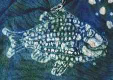 How I made it... See How to Batik for instructions. I just drew with a tjanting and melted mixed beeswax and paraffin. (Key hint: batiking failed for me when I first tried it; I finally learned this was because the melted wax was not hot enough. Getting an electric frying pan solved that problem and made it easy.) Days later, I dyed them with Procion MX type dyes (see recipe) and washed them out in cold water.