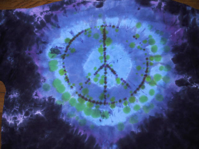 The next day, I rubber-banded the shirt with the peace signs at the center, and dyed the outer edges of the front, brighter sign (having first encased the center of the design in plastic for protection against stray drops of dye), and completely overdyed the back one. Since the weather was cool, I placed the shirt in a glass container, covered it tightly with plastic wrap, and microwaved at 20% power until the shirt was quite warm to the touch, about four minutes (times vary dramatically in various nmicrowaves, and fabric that is overheated in the microwave, past the point of dryness, will burn, so, if you try this yourself, be sure to check frequently to determine when the damp material is warm).