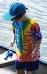 Next, while the shorts and other garments pre-soaked in sodium carbonate solution, I mixed the dyes: one bottle (4 to 16 ounces each) of scarlet (I bought it pre-mixed this time, instead of mixing it myself from fuchsia plus a tiny bit of lemon yellow), fuchsia, purple, blue, turquoise, green, and yellow. I more or less applied one color per quadrant, as divided by the rubber bands. I took particular pains not to leave too much fabric undyed: I stuck the tip of the squirt bottle's nozzle way down into the folds, and I squeezed the fabric disk after applying the colors. I did not try to extend each color all the way to the center of the disk, because doing so results in a muddy color near the center of the swirl.