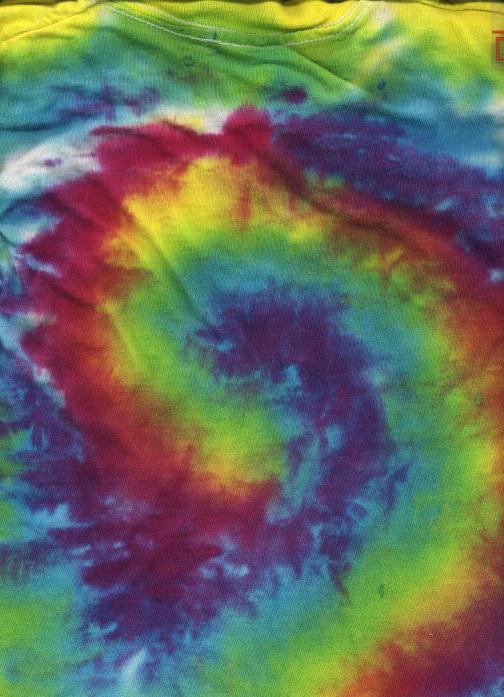 I laid the pre-soaked shirt flat on a table whose top is composed of a 1/4 inch wire grid, then carefully applied the dyes in a sort of spiral design directly from the squirt bottles....a simple technique, and one of my favorites. Otherwise, I followed the usual technique.