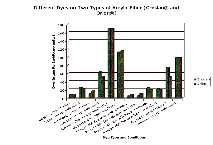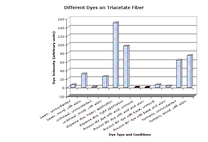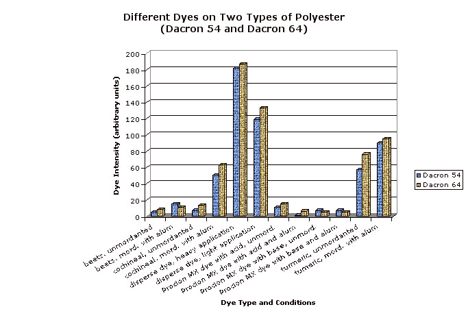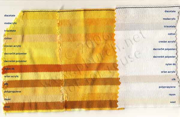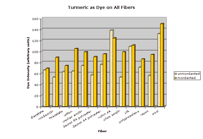 All of the synthetic fibers except for nylon and rayon like disperse dye the best, and mordanted turmeric somewhat.