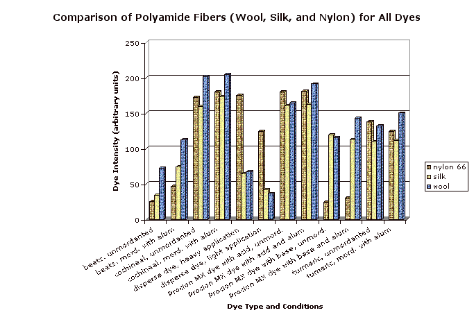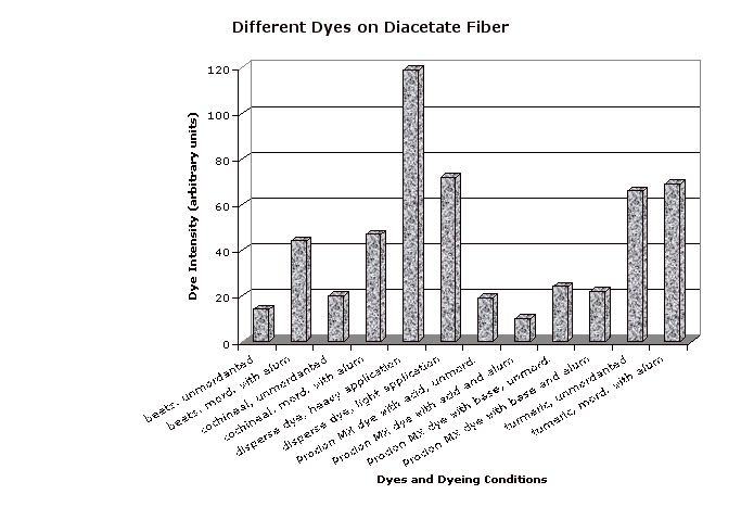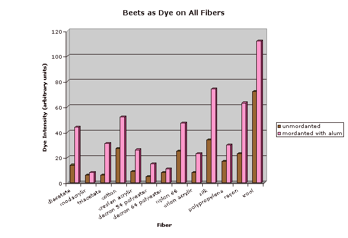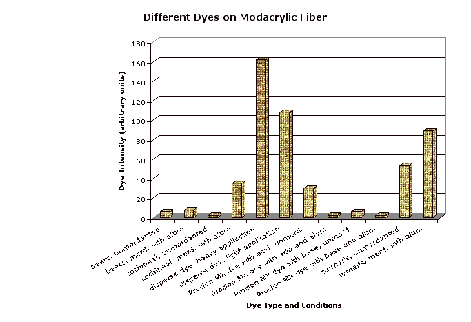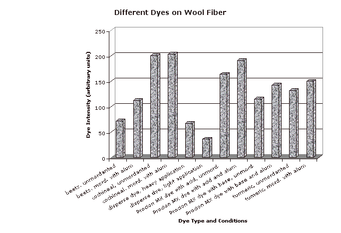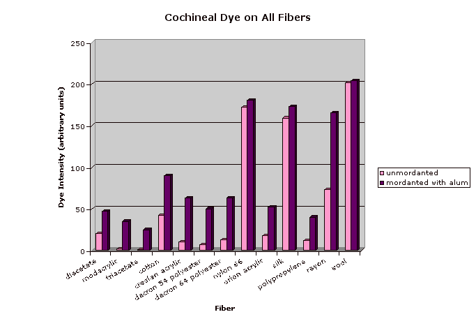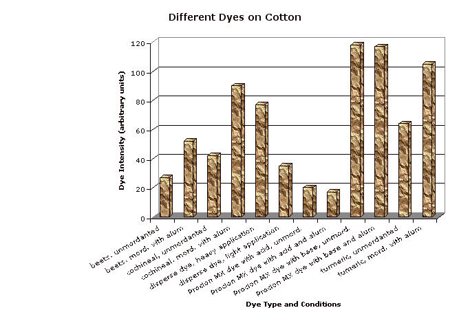 Unmordanted samples (except for disperse dye) are indicated by an upper corner cut from the swatch. The mordanted samples were treated by boiling in a 25% by weight of fabric solution of alum (purchased from Aurora Dyes) then cooling overnight. (Note that cotton is better mordanted by treating with alum, then tannic acid, then alum again.) Each swatch is shown with an undyed control swatch. Note that the different undyed fibers are not all perfectly white. The dye intensity was obtained by subtracting the luminosity for a representative section of each fiber strip (avoiding shadows and light spots due to air bubbles during dyeing) from the same value for the corresponding undyed control. Since scans made at different times may vary somewhat in darkness or contrast, every scan included the control, and only the control values from the same scan were used.