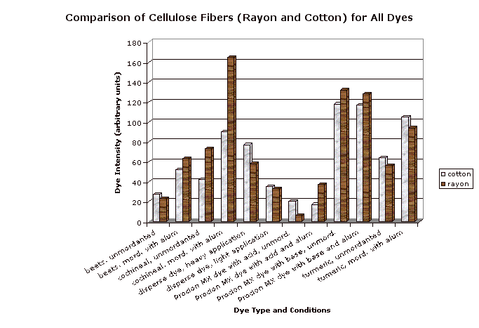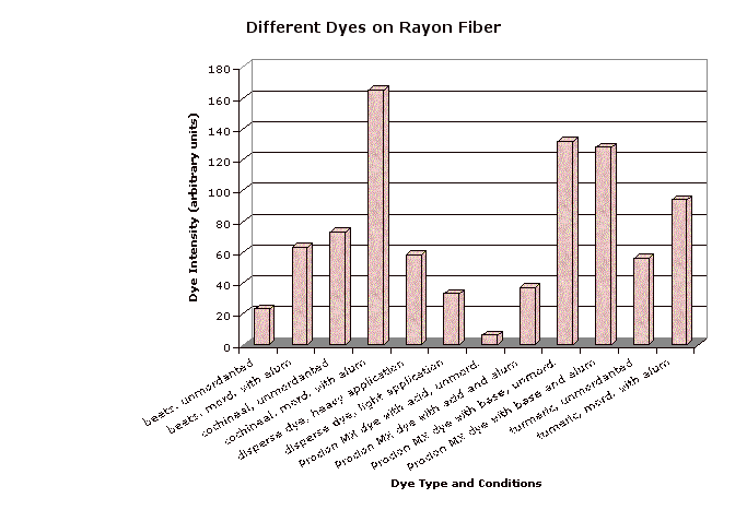 Rayon, like cotton, likes mordanted cochineal, basic MX dye, and mordanted turmeric. (Rayon is a synthetic fiber, but it is a true cellulose fiber and thus closely resembles mercerized cotton.)