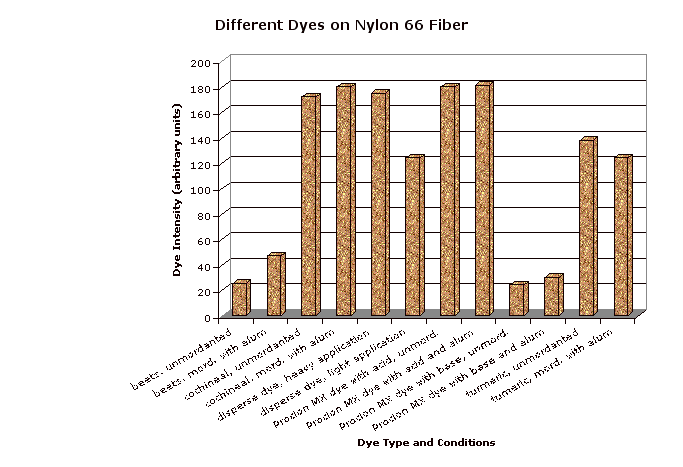 On silk an adequate beige was obtained only with the alum mordant. On wool, a good orangish tan was achieved without the mordant, and a darker tan with the alum premordanting. All other fibers either stayed white or acquired at most a pale stain.