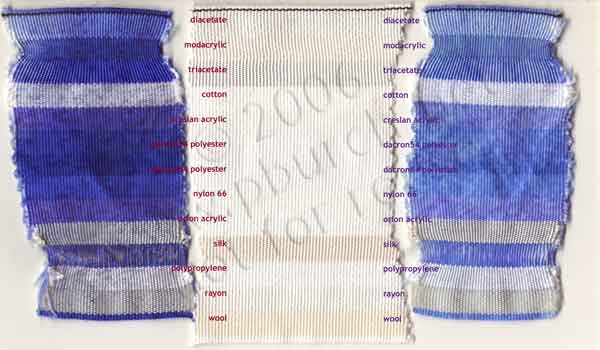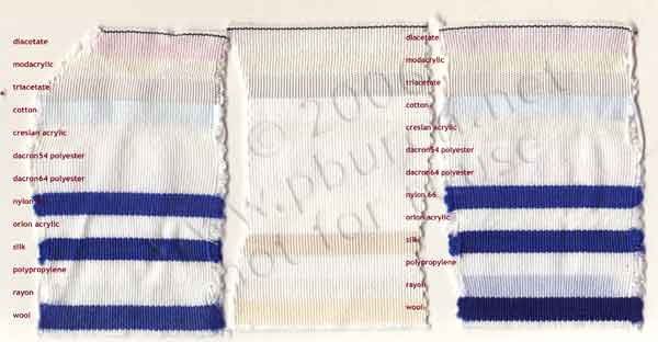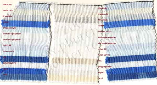 The testing fabric used was a multi-fiber ribbon, 4 inches wide, containing 13 different fibers, manufactured by TestFabrics, Inc. (415 Delaware Avenue, PO Box 26, West Pittston, PA 18643; phone 717-603-0432; fax 717-603-0433), their "Warp Stripe 13 Fiber Fabric". The fabrics are, in order (starting with the black stripe at the top, or from the left side of the chart):
